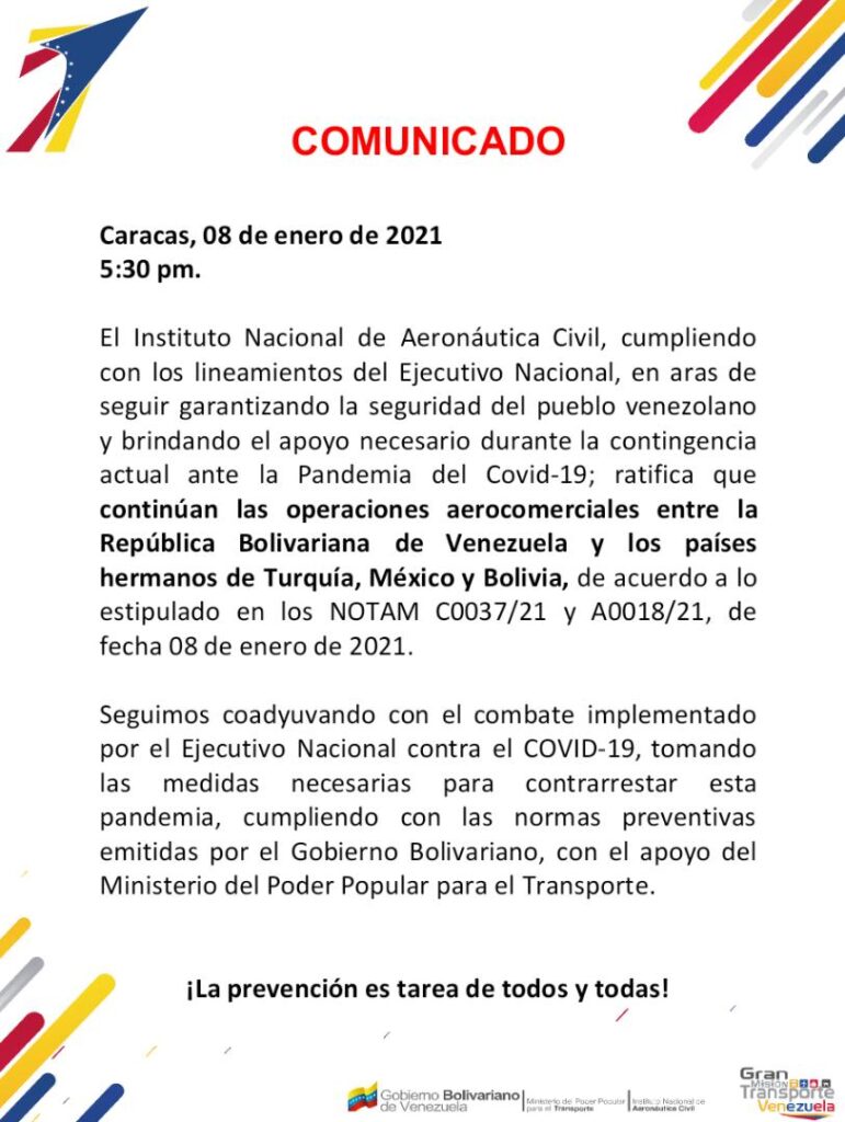Se trata de los vuelos desde y hacia Turquía, Bolivia y México. A través de un comunicado, el Instituto exhorta al cumplimiento de las medidas y protocolos de bioseguridad.