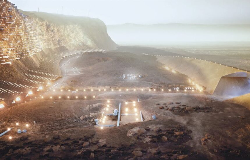 Los terrícolas que se afinquen en Marte deberán vivir siempre a cubierto. Una vuelta a la cueva, ahora con tecnología punta. Pues la atmósfera marciana no protege de la radiación, que sería mortal. Por eso, los conjuntos de viviendas y los equipamientos se acoplan en grandes túneles interconectados excavados en la tierra, que el proyecto sitúa en el seno de un acantilado. Estas viviendas soterradas, explica Muñoz, responden también a que la diferencia de presión entre el interior de los edificios y el exterior haría que estos explotaran. Marte, además, presenta variaciones extremas de temperaturas, que implicarían una gran cantidad de energía para mantener el confort interior.