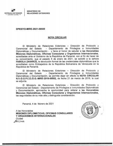 “La Cancillería mediante la dirección de protocolo y ceremonial del Estado, el departamento de privilegios e inmunidades diplomáticas y documentación, dejan sin efecto la nota ciruclar N.V.-D.G.P.C.E./D.G.-MIRE-2019-05552, de fecha 21 de marzo de 2019, en la que, el entonces presidente Juan Carlos Varela Rodríguez, recibió las cartas credenciales de Fabiola Zavarce, que le acreditan como única embajadora extraordinaria y plenipotenciaria de Venezuela ante Panamá”, dice el comunicado.