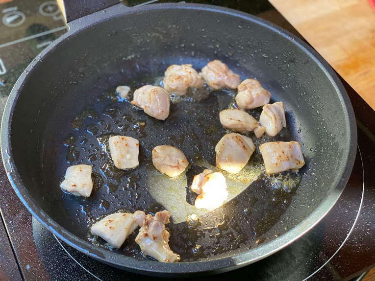 Añadimos 2 cucharadas de aceite de girasol en un wok y, una vez bien caliente, agregamos el jengibre rallado y el pollo troceado. Freímos la carne hasta que veamos que comienza a dorarse. Retiramos y reservamos.