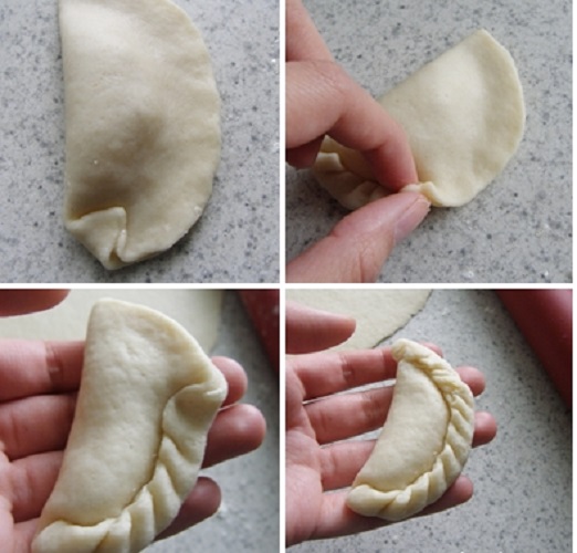 2-La segunda, cerrar la empanada y tomar el extremo bajo de la empanada y doblar hacía arriba. Seguir doblando y doblando con cuidado sin aplastar de más la empanada para que no se salga el relleno.