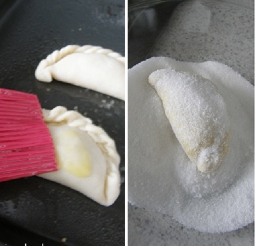 5-Retirar del horno y colocar en un recipiente con azúcar para cubrir muy bien las empanadas cuando todavía están calientes.