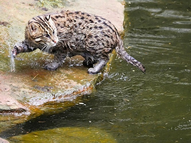 Además, comparten una característica —pocas veces vista entre los felinos— con el guepardo: sus garras siempre están expuestas, aunque sea de manera parcial, ya que no son completamente retráctiles. Esto les permite atrapar con facilidad a sus presas debajo del agua. Así como los patos, sus dedos están palmeados, y cuentan con almohadillas largas.