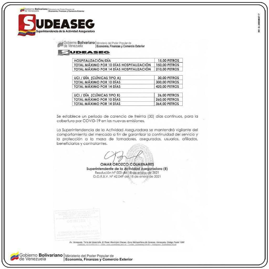 Asimismo, la Sudeaseg estableció que para la atención en UCI en una clínica Tipo B la cobertura de una póliza por 14 días será de 364 petros (20.489,56 dólares), lo que equivale a 26 petros diarios (1.463,54 dólares).