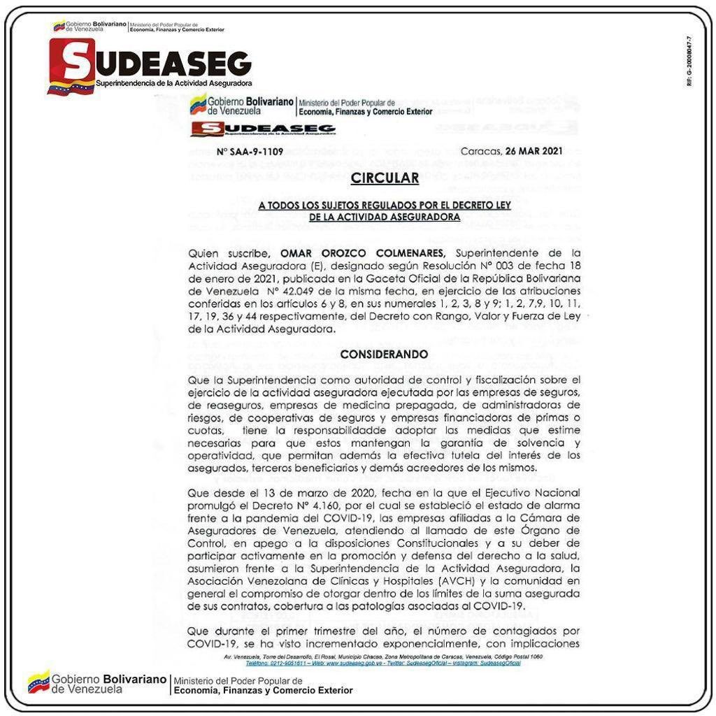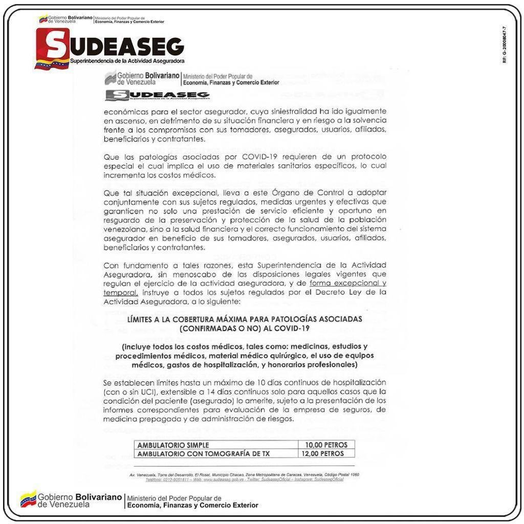 En esta circular, la Sudeaseg comunicó a las aseguradoras que solo se les exigiría cubrir hasta 14 días de cuidados intensivos en clínicas privadas y pagar un máximo de US$25,000 por paciente con coronavirus.