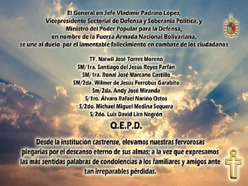 «Desde la institución castrense elevamos nuestras fervorosas plegarias por el descanso eterno de sus almas, a la vez que expresamos las más sentidas palabras de condolencias a los familiares y amigos ante tan irreparables pérdidas», publicó el ministerio en la esquela.