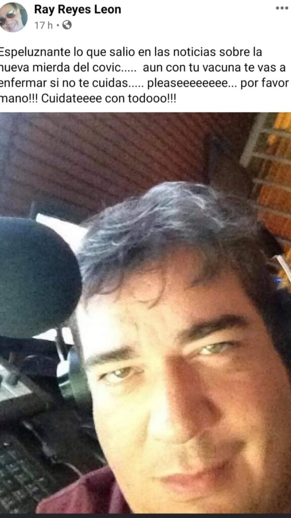 La última publicación en redes sociales hecha por Ray Reyes León la realizó en su perfil de Facebook, la madrugada de este 30 de abril. En ella expresó su miedo por la pandemia de COVID-19 y la posibilidad de contraer la enfermedad a pesar de estar vacunado contra el virus.