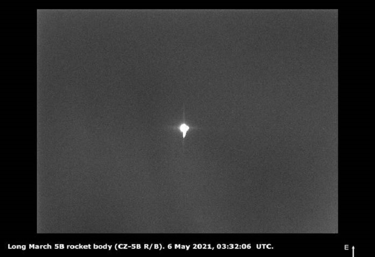 Astrónomos italianos han publicado la primera imagen del cohete rojo Long March 5B de China que ha provocado incertidumbre por lo que se estima puede ser un reingreso descontrolado a la atmósfera de la Tierra.