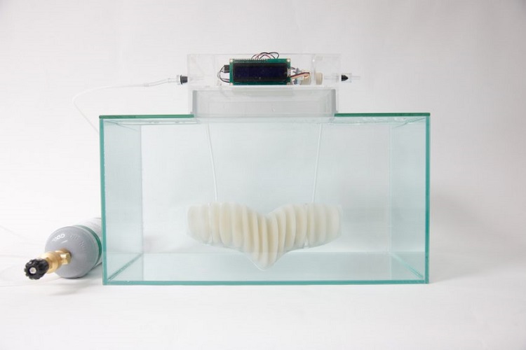 El dispositivo blanco, que vemos en las imágenes, se coloca alrededor del cuello y el pecho y funciona como las branquias de un pez. Es hueco por dentro y contiene aire, que se puede inhalar y exhalar a través de la máscara conectada mediante un tubo.
