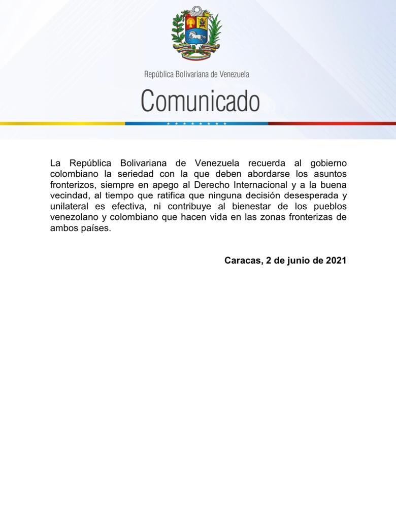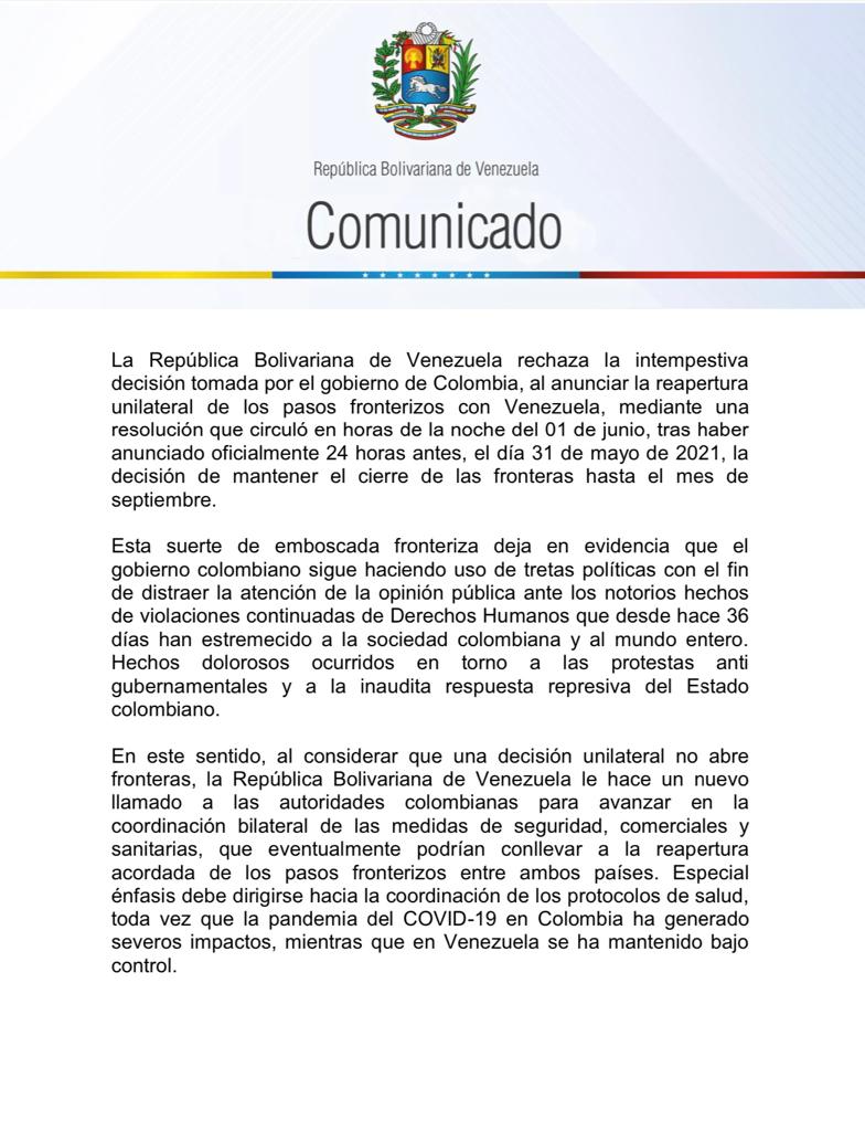 En un comunicado, Arreaza califica la apertura como una “emboscada fronteriza” que «deja en evidencia que el gobierno colombiano sigue haciendo uso de tretas políticas con el fin de distraer la atención de la opinión pública ante los notorios hechos de violaciones continuadas de los Derechos Humanos que desde hace 36 días han estremecido a la sociedad colombiana y al mundo entero”.