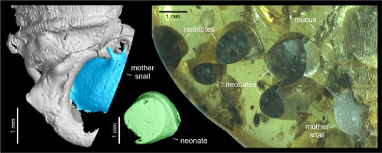 El cuerpo y el caparazón de una hembra de caracol terrestre ha sido descubierta en Myanmar excepcionalmente bien conservada poco después del nacimiento de su descendencia, que también se conserva en ámbar