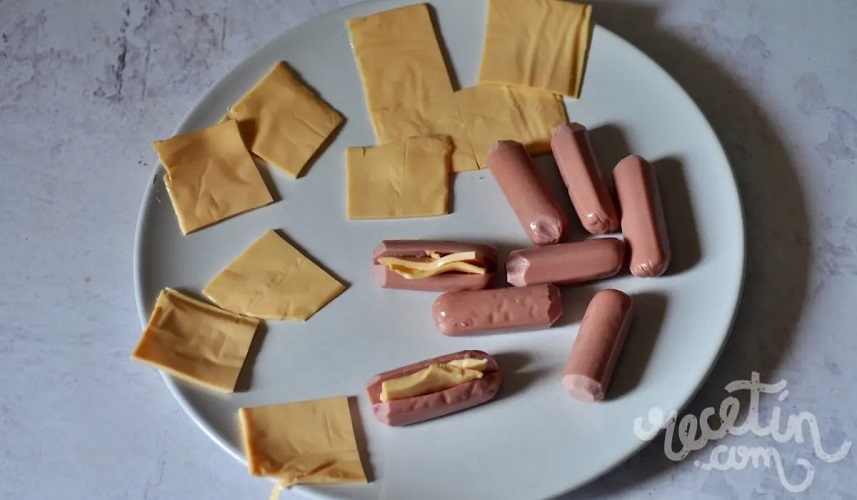 2-Les hacemos un corte en el centro. Cortamos las lonchas de queso en 4 partes. Ponemos una porción de loncha en el interior de cada salchicha.