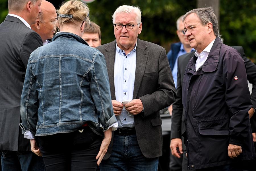 Steinmeier recorrió Erftstadt, uno de los distritos más castigados por el temporal que ha afectado a esa parte del país y la vecina Bélgica. Le acompañaba el primer ministro del «Land» de Renania del Norte-Westfalia y candidato conservador a la Cancillería, Armin Laschet.