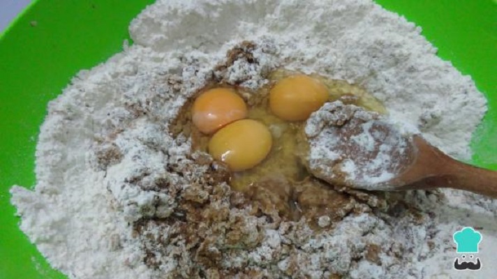 8-Este es el momento de precalentar el horno a 180 – 200 °C. Adiciona las especias molidas al papelón, que ya tiene el licor, y también la harina. Mézclalos un poco.