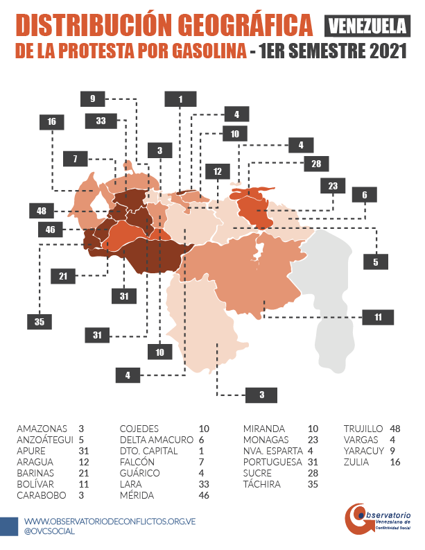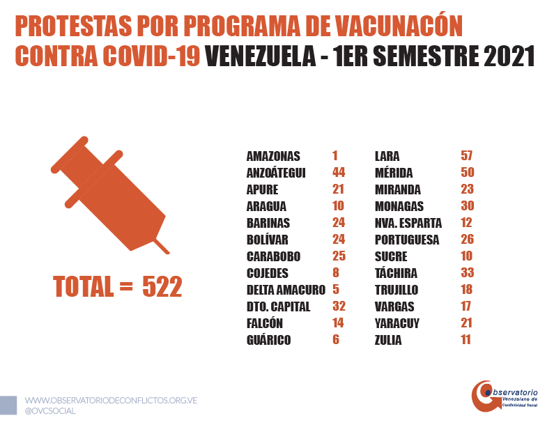 El Observatorio Venezolano de Conflictividad Social (OVCS) registró 3.393 protestas durante el primer semestre de 2021, equivalente a un promedio de 19 diarias. Esta cifra representa una disminución de 23% en comparación con el mismo período del año anterior.