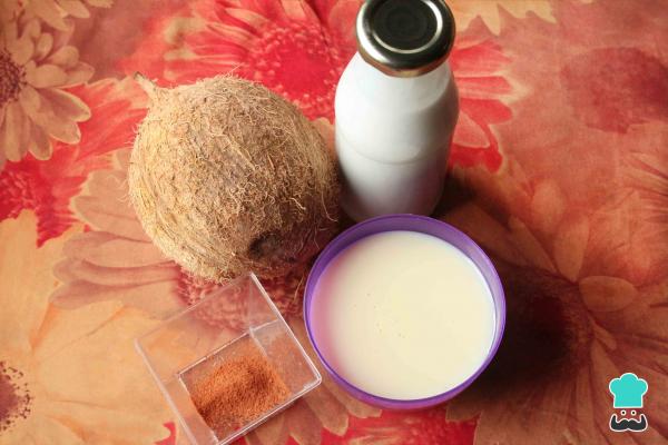1-Coloca los ingredientes en el espacio de trabajo. Mide la leche condensada (390 gr.), la leche de coco (500 mililitros), una pizca de canela y reserva. Por otra parte, quiebra el coco.