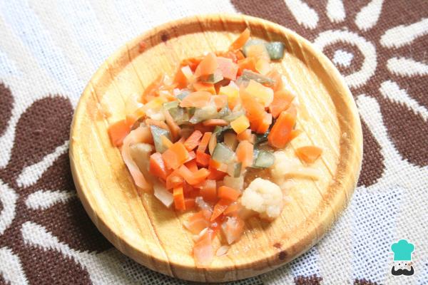 1-Vacía el frasco pequeño de encurtidos y escurre los vegetales. Separa lo sólido de lo líquido. Reserva ambos por separado.