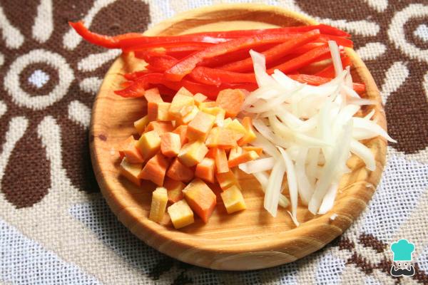 2-Lava y pica la cebolla y el pimentón estilo juliana. Mientras que la zanahoria córtala en cubos.
