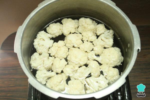 4-Coloca dentro de una olla los arbolitos de coliflor. Hierve con suficiente agua y añade 1/2 cucharadita de azúcar y 1/2 de sal. Espera 10 minutos antes de retirar del fuego. Posteriormente, escurre y reserva.