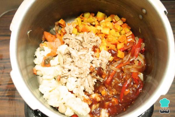 9-Añade a la preparación la coliflor, la zanahoria, el atún, la salsa de tomate y 4 cucharadas del vinagre del encurtido. Espera 15 minutos y pon a fuego medio. Remueve y mezcla muy bien todos los ingredientes.