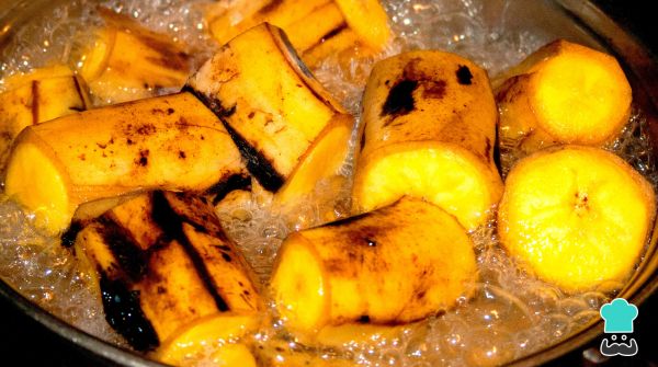 1-Empezamos por cocinar los plátanos. Para ello, coloca una olla con agua suficiente para cubrir todos los plátanos, previamente troceados, sin retirar la piel. Lleva al fuego y deja que hierva hasta que estén tiernos.