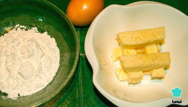5-Prepara tu mesa de trabajo con todos los ingredientes y utensilios necesarios para realizar los tequeños de plátano. Dispón en recipientes las medidas necesarias de todos los productos y corta el queso en pequeños rectángulos delgados.