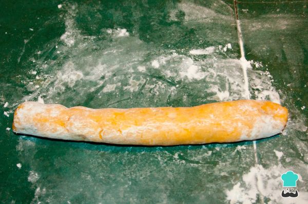 7-Amasa como una plastilina, una de las bolas. Realiza una trenza y utiliza una botella o las manos para aplanarla.