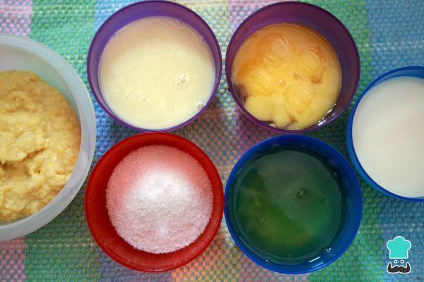 6-Incorpora la pasta de maíz, la leche condensada, la leche entera y el queso.