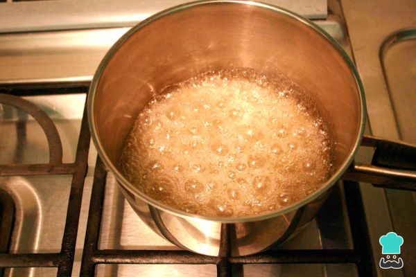 7-Deposita dentro de una olla el azúcar y luego añade el agua, a fuego alto. Cuando veas las primeras burbujas, debes vigilar el caramelo o se puede quemar. Cuando comience a ponerse rubio, remueve. En lo que el caramelo, se vea totalmente avellanado, puedes retirarlo. El caramelo es la presentación principal de nuestro quesillo de jojoto.