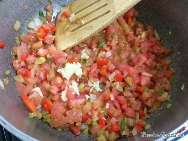5-Agrega el tomate pelado y cortado en cubos pequeños, el ajo cortado finamente, cocina a fuego bajo, tapalo hasta que suelte sus jugos.