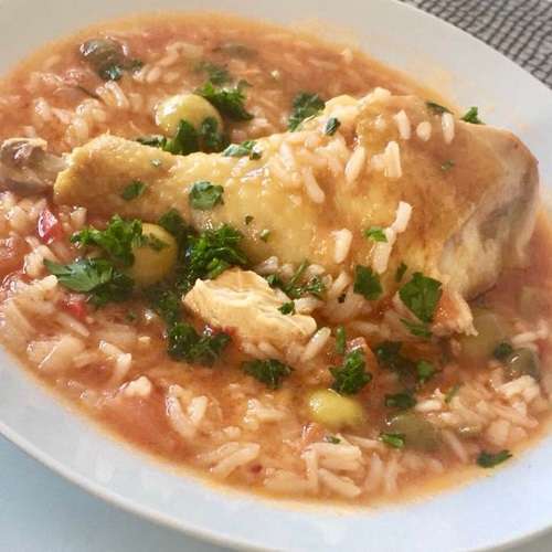 6-Añade 4 tazas de agua, los muslos de pollo, las alcaparras, sal, pimienta y comino. Cuando el agua esté hirviendo agrega la taza de arroz, cocina a fuego bajo hasta que el arroz esté blando, revuelve constantemente para evitar que se pegue.