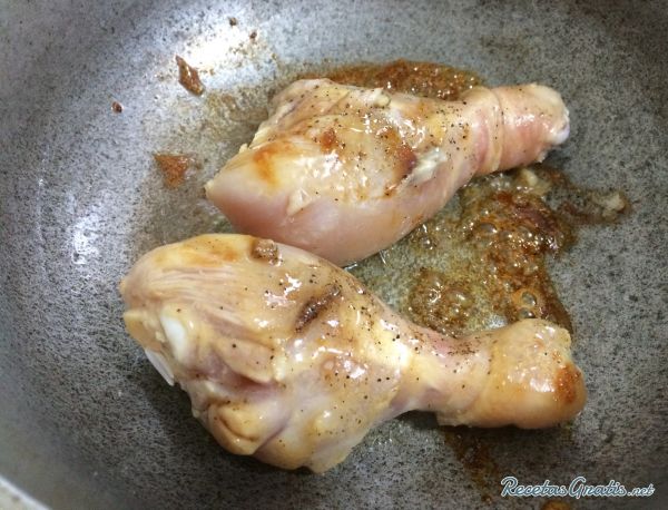 3-Añade los muslos al sartén previamente salpimentados y sella hasta que estén caramelizados por el papelón.