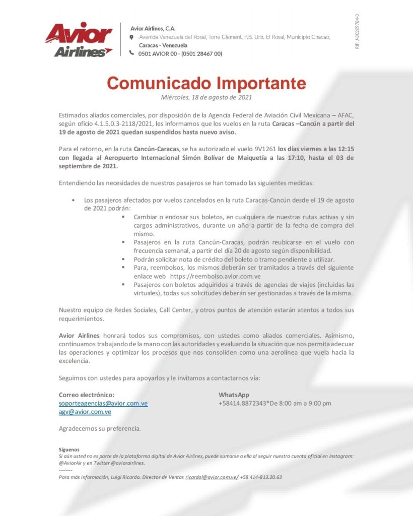 La línea aérea Avior informó este miércoles que por disposición de la Agencia Federal de Aviación Civil Mexicana (AFAC), fueron suspendidos los vuelos en la ruta Caracas-Cancún.