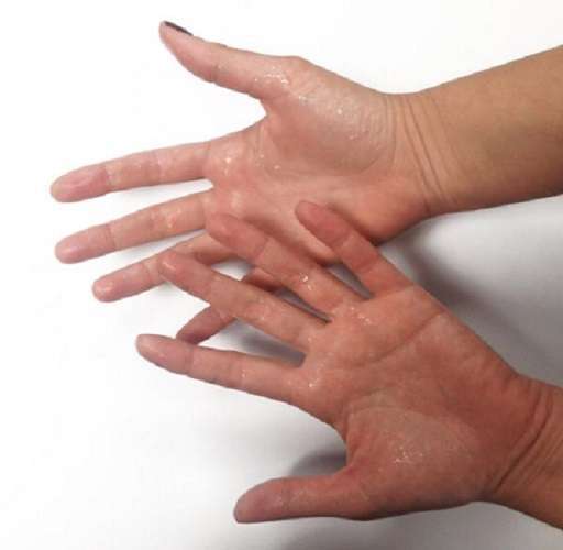 Las personas con hiperhidrosis producen sudor en cantidades mucho mayores de las necesarias para controlar su temperatura corporal; especialmente en las palmas de las manos, las plantas de los pies y las axilas