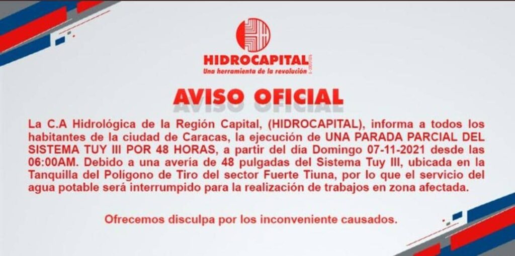 «Hidrocapital informa a todos los habitantes de la ciudad de Caracas, la ejecución de una parada parcial del Sistema Tuy III por 48 Horas, a partir del día Domingo 07-11-2021 desde las 06:00 am», escribió en un mensaje en Twitter.
