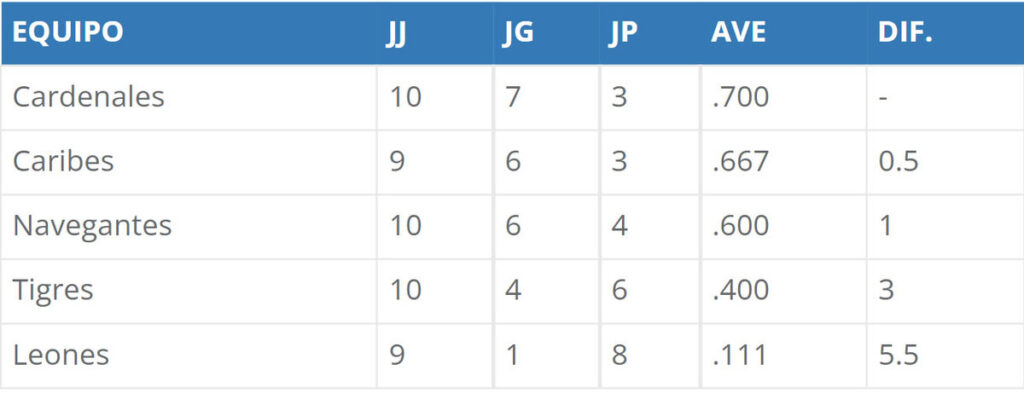 Cardenales (7-3), descansará en la jornada del domingo y enfrentará el lunes a Caribes. Mientras Magallanes (6-4), chocará contra los orientales en Valencia durante la jornada dominical.