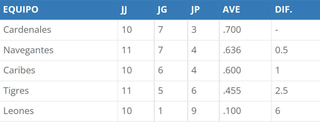Navegantes (7-4), quedó a medio juego del líder Cardenales y descansará el lunes para enfrentar un día después a Leones en Caracas. Mientras que, Caribes (6-4), iniciará una serie definitoria de dos juegos frente a los pájaros rojos en Barquisimeto.