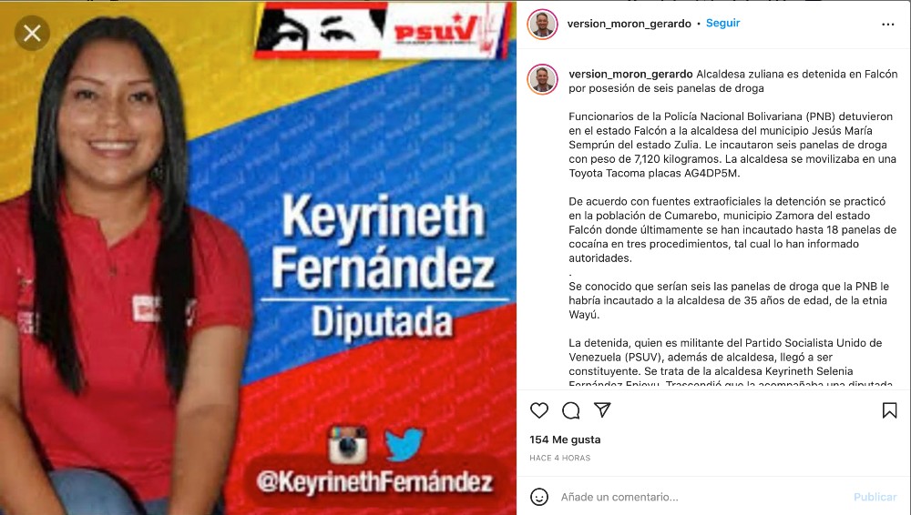 Funcionarios de la Policía Nacional Bolivariana (PNB) detuvieron en el estado Falcón a la alcaldesa del municipio Jesús María Semprún del estado Zulia. La mujer fue identificada como Keyrineth Selenia Fernández Epieyu, militante del Partido Socialista Unido de Venezuela (Psuv).