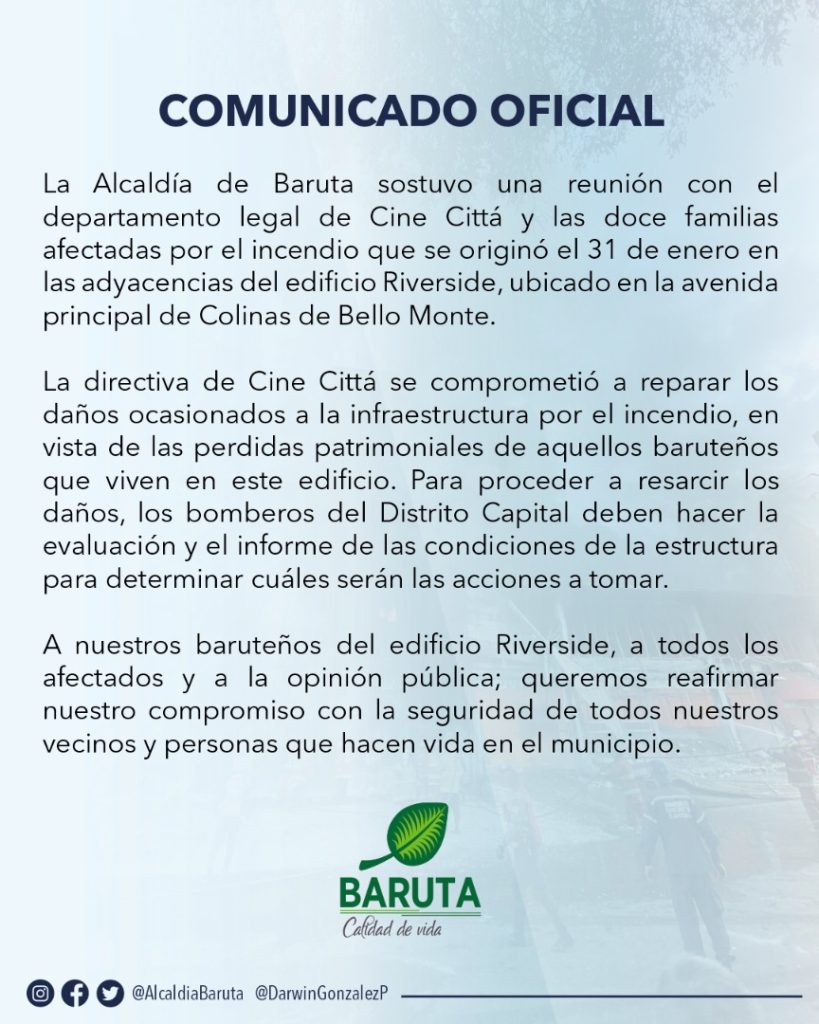 Las familias que habitaban el edificio Riverside, afectados por el incendio registrado en Cine Città, Bello Monte del municipio Baruta; esperan una solución oportuna ante las pérdidas de sus bienes.