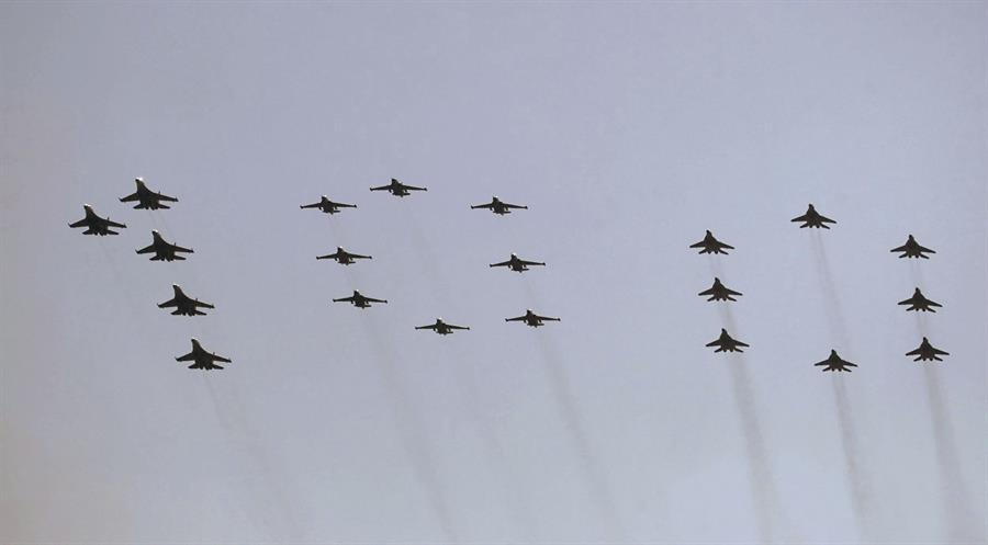 aviones rusos Su-27, Su-25 y Mig-29 en una exhibición aérea en Zhukovsky, en la región de Moscú, (Rusia). EFE/Maxim Shipenkov