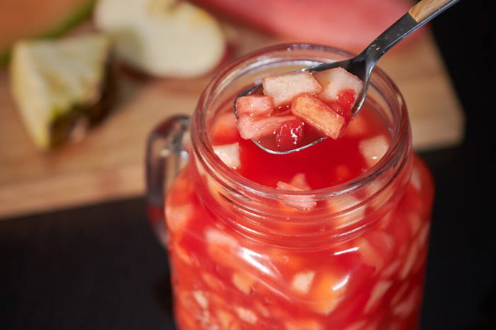 Este brebaje está elaborado con varios zumos y frutas picadas, todo mezclado.