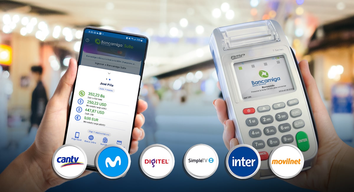 Digitel, Movistar, Movilnet, Simple TV e Inter se pueden recargar en Bancamiga enlínea, puntos de venta Bancamiga y en el aplicativo Bancamiga Suite. También sepuede cancelar la factura de Cantv y próximamente se sumará Corpoelec.