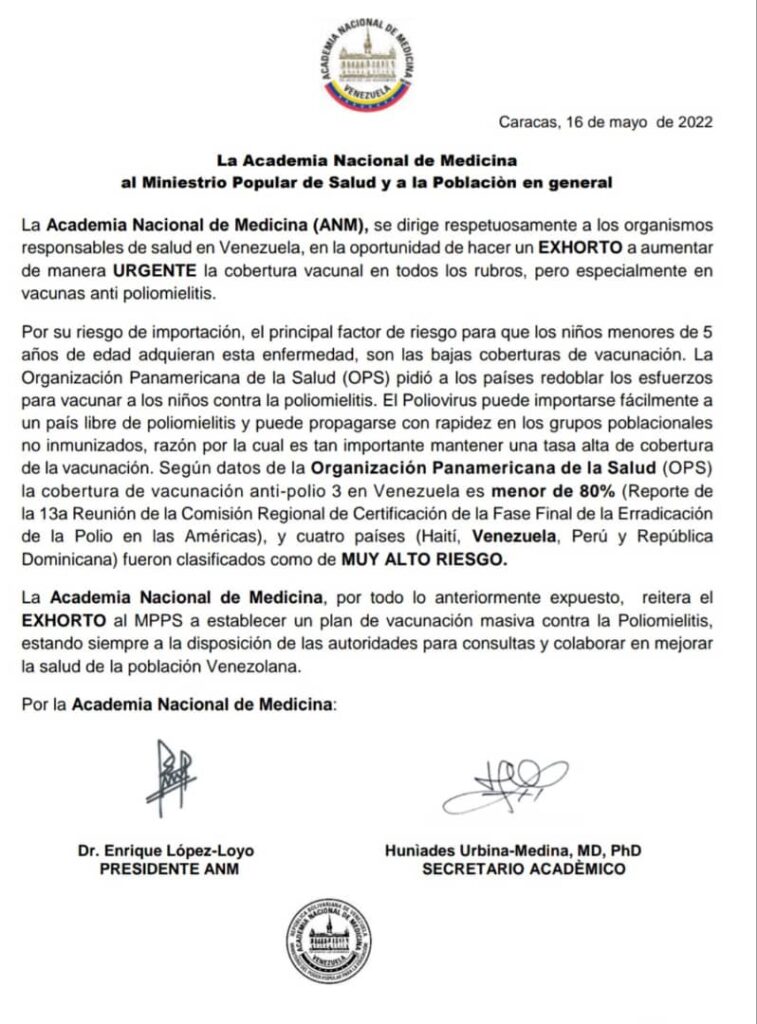 La Academia Nacional de Medicina exigió a la administración de Nicolás Maduro aumentar la cobertura de vacunación de niños, «especialmente en lo que se refiere a la antipoliomielitis».