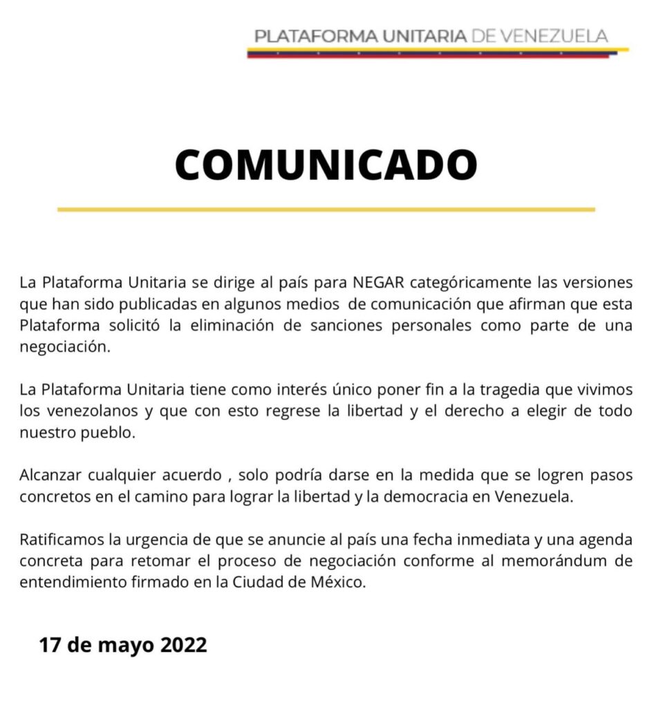 «La Plataforma Unitaria se dirige al país para negar categóricamente las versiones que han sido publicadas en algunos medios de comunicación que afirman que esta Plataforma solicitó la eliminación de sanciones personales como parte de una negociación», reza el texto.