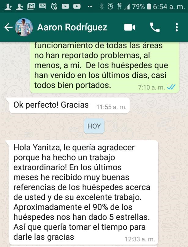 Cuando le dije a mi jefe que me cambiaría de empleo me escribió un mensaje muy lindo dándome las gracias por el buen trabajo que había hecho. Me dijo que la casa que estaba a mi cargo era la que tenía las opiniones más positivas, porque los huéspedes se iban satisfechos».