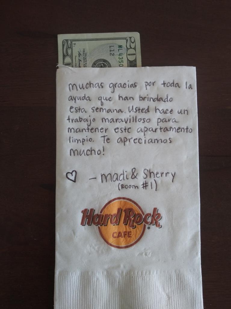 Recuerdo que en mi primera semana trabajando allí se hospedaron una señora y su hija, ambas estadounidenses, y solo hablaban inglés. Pero aun así hicimos el esfuerzo y terminamos entendiéndonos un poco. Me preguntaron si había donde lavar y les expliqué que sí, y las llevé al sótano, donde están las lavadoras y secadoras. Como no tenían detergente, les regalé un poco del mío. Estuvieron unos cuatro días y no nos pudimos despedir porque ellas salieron de madrugada. Cuando entré a su habitación para hacer la limpieza, encontré una propina de $20 y una nota de despedida escrita en español en una servilleta. Me imagino que la muchacha buscó un traductor en línea.