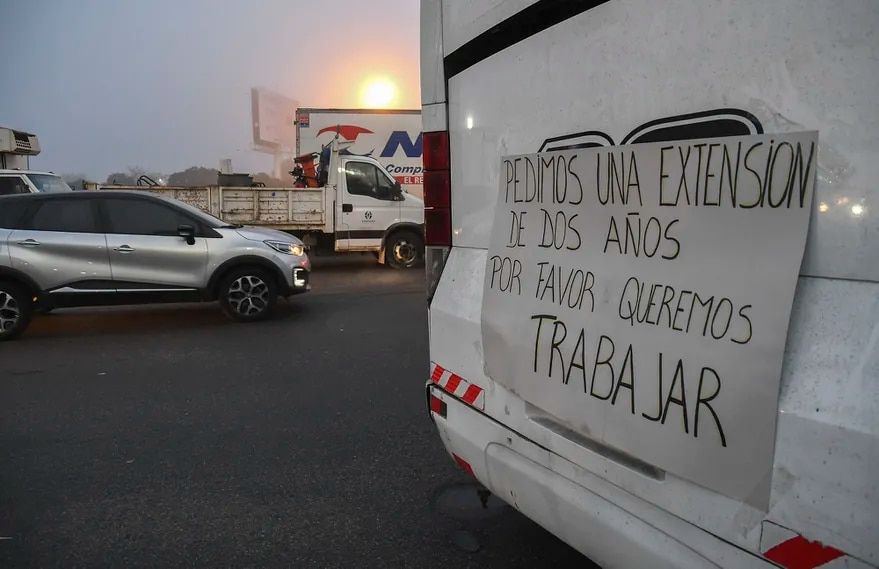 Los choferes, ubicados a la altura del peaje Dock Sud, reclaman que se los autorice a seguir conduciendo por dos años más sus unidades, ya que durante la etapa más crítica de la pandemia esos colectivos no estuvieron operando.