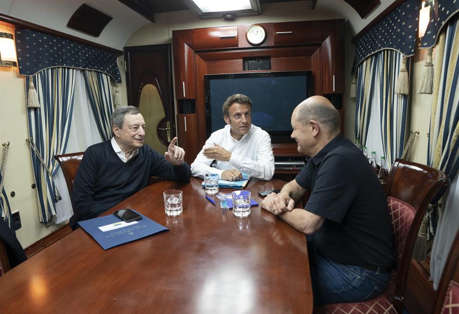 Europa unida en su apoyo a Ucrania: Este viaje «es un mensaje de unidad europea a los ucranianos y las ucranianas, de apoyo para hablar a la vez del presente y del futuro, porque sabemos que las próximas semanas serán muy difíciles», dijo Macron nada más llegar a Kiev acompañado de Scholz y Draghi.