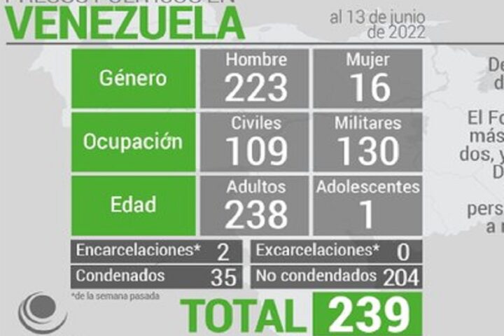 La ONG Foro Penal afirmó este jueves que en el país hay 239 presos políticos, dos más con respecto a su último reporte, publicado el pasado 24 de mayo.