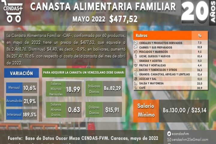El precio de la canasta alimentaria básica se ubicó en mayo en 477,52 dólares, por lo que el salario mínimo mensual -28,07 dólares- solo cubre 5 % de los productos de primera necesidad, informó este lunes por el Centro de Documentación y Análisis Social de la Federación Venezolana de Maestros (Cendas-FVM).